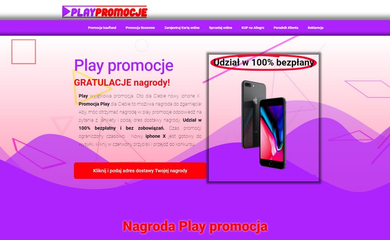 Coś nam ostatnio obrodziło tymi oszustwami... strach się bać. Oszukańcza wiadomość wygląda tak, jak na powyższym zrzucie ekranu. Po odwiedzeniu strony zawartej w linku dowiemy się, że „możemy odebrać za darmo” egzemplarz jednego z nowych modeli iPhona lub Samsunga. Nie wiadomo, jak dokładnie wyglądałoby oszustwo gdyby dalej weń brnąć - jak dotąd nikt nie był na tyle głupi, by to zrobić a następnie pochwalić się wynikami - ale prawdopodobnie byłaby to standardowa kradzież danych do logowania do waszych usług bankowych. Wątpliwości budzi zarówno sam link strony, który nie znajduje się w domenie Play, jak i jej wygląd - poważnie, nawet największy profesjonalny dyletant nie wyprodukuje w dzisiejszych czasach takiego badziewia. Krótko mówiąc, tym razem oszuści nie popisali się inwencją ani zdolnościami.