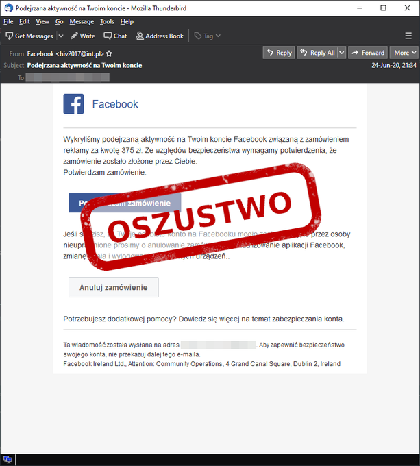 Przykład oszukańczego maila. Dziękujemy CERT Polska za kolejne ostrzeżenie.