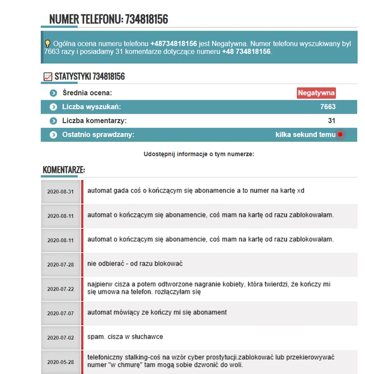 Zagrożone numery to 734818156, 734818190 i 734818186. Wszystkie trzy łączą tego samego rodzaju opinie w sieci.