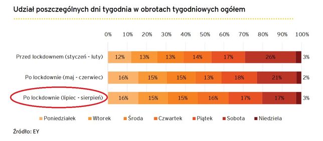 - zmiana najczęstszego dnia robienia zakupów z soboty na poniedziałek - wykres,