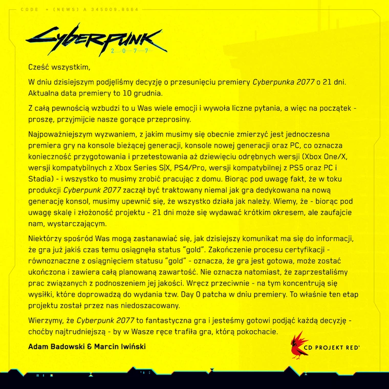 19 listopada? Ha! Nowa data premiery gry CD-Projekt to 10 grudnia 2020. Kolejne, trzecie już przesunięcie wydania Cyberpunk 2077 ma konkretną przyczynę; jak możecie przeczytać w oficjalnym oświadczeniu firmy, chodzi o konieczność przystosowania kilku różnych wersji gry na premierę. Tego samego dnia gra ma trafić na pecety oraz kilka różnych konsol i upewnienie się, że każda wersja będzie jak najlepiej dopracowana wymaga dania CD-P trochę więcej czasu. Sprawę komplikuje też konieczność pracy developerów z domu.