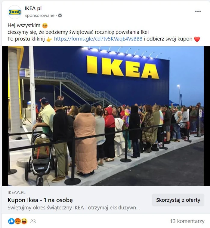Czyli phishing numer 49234698. Cyber-złodzieje po raz kolejny kuszą ewentualne ofiary rabatem z okazji rzekomych urodzin sieci IKEA. Skąd wiemy, że to oszustwo? Cóż, pomijając takie kwestie, jak brak odpowiedniej interpunkcji w wiadomości, podejrzany adres (ikeaa.pl) i podejrzana nazwa strony (IKEA pl), pozostaje też fakt, że informacji na temat tej promocji nie ma na stronie głównej sieci. Poza tym urodziny sieci są w sierpniu.